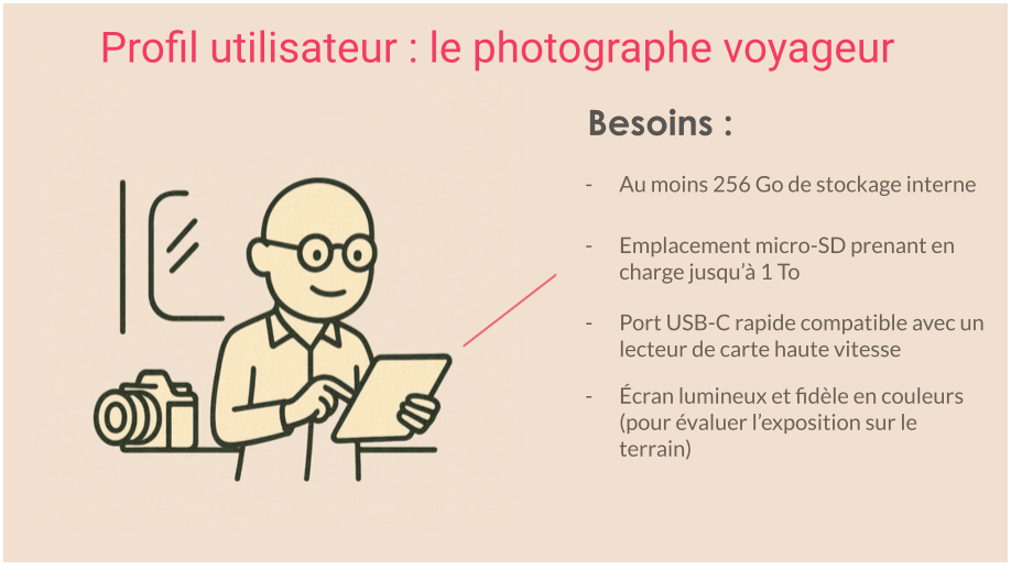 Enfin, pour vous donner une idée de la manière dont les spécifications et les fonctionnalités correspondent aux usages du quotidien, voici quelques profils d’utilisateurs.