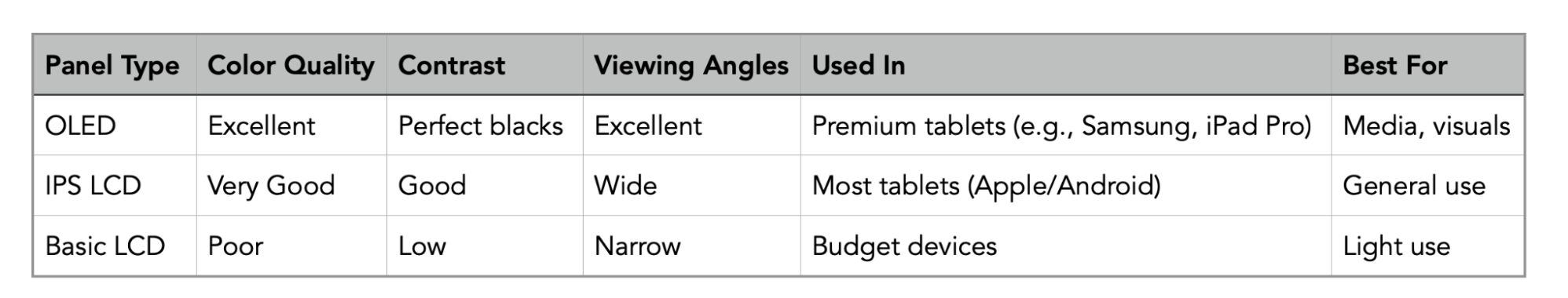 La plupart des tablettes modernes utilisent soit des dalles IPS LCD, soit des panneaux basés sur l’OLED. Les modèles OLED, privilégiés sur les tablettes haut de gamme, se distinguent par leurs couleurs vives et leurs noirs parfaits. Chaque pixel étant auto-éclairé, le contraste est remarquable et les images sont éclatantes.
