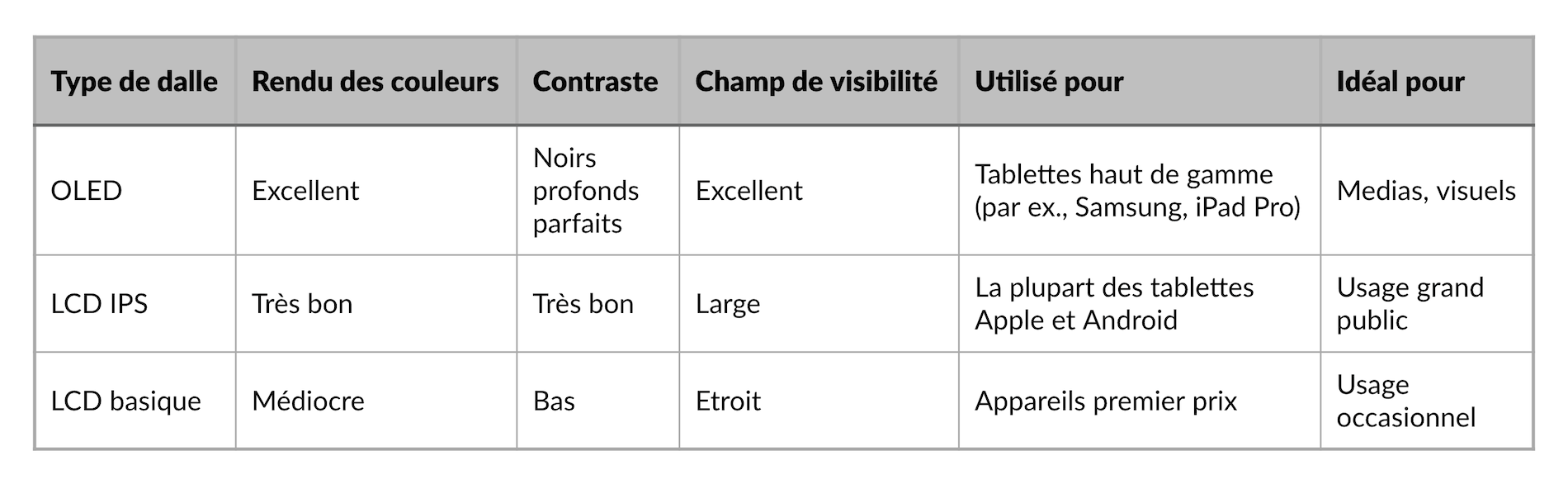 Les écrans IPS LCD, bien que moins percutants, offrent néanmoins une excellente précision des couleurs et de bons angles de vision, et sont courants sur les appareils Apple comme Android. En revanche, les écrans LCD d’entrée de gamme souffrent souvent d’angles de vision médiocres et de couleurs ternes, ce qui dégrade la qualité visuelle.
