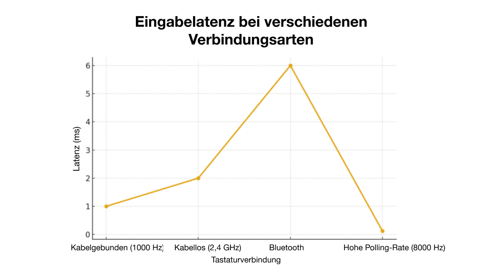 Die Eingabelatenz beschreibt die Verzögerung zwischen dem Drücken einer Taste und der Ausführung der Aktion. Eine niedrige Latenz ist für Spiele entscheidend. Kabelgebundene Tastaturen erreichen typischerweise unter 1 ms, während kabellose Modelle (auch hochwertige Lightspeed- oder Bluetooth-Varianten) oft ein paar Millisekunden darüber liegen. Viele Spieler bevorzugen kabelgebundene Tastaturen oder die schnellsten Funkmodelle, wenn jede Millisekunde zählt.