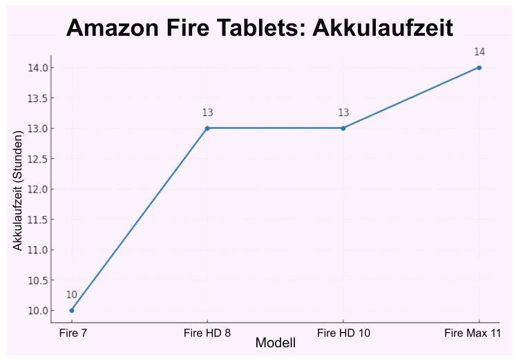 Die Laufzeit ist innerhalb der Serie sehr konstant. Das Fire 7 hält etwa 10 Stunden durch, das HD 8 und HD 10 rund 13 Stunden und das Max 11 bis zu 14 Stunden. Damit kommen Nutzer im Alltag problemlos durch den Tag. Schnellladen wird nicht unterstützt, doch alle aktuellen Modelle nutzen USB-C, sodass sich die Tablets unkompliziert mit Standardkabeln laden lassen.