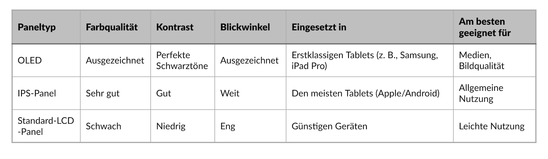 IPS-LCDs sind zwar nicht ganz so intensiv, bieten aber dennoch sehr gute Farbgenauigkeit und weite Blickwinkel. Sie kommen bei Apple- und auch bei Android-Geräten häufig zum Einsatz. Günstigere LCDs hingegen haben oft schlechte Blickwinkel und blasse Farben, was die Bildqualität deutlich mindert.