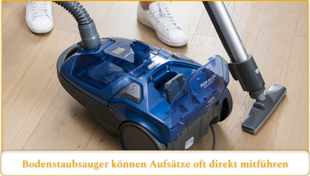 - In der gehobenen Ausführung kommen Bodenstaubsauger oft mit mehr Aufsätzen als andere Modelle, da diese im Motorbereich verstaut werden können.