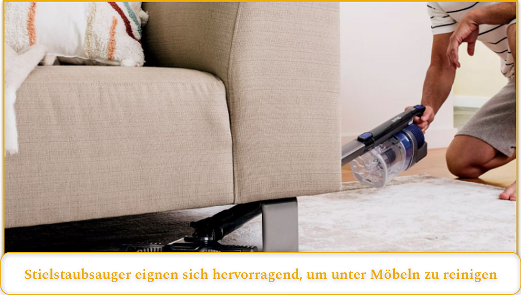 Für kleinere Wohnungen und wenn du Böden, Arbeitsflächen und Polster reinigen willst, empfehle ich einen kabellosen Stielstaubsauger. Viele Modelle lassen sich in Handstaubsauger umwandeln und bieten sogar Aufsätze zum Wischen.