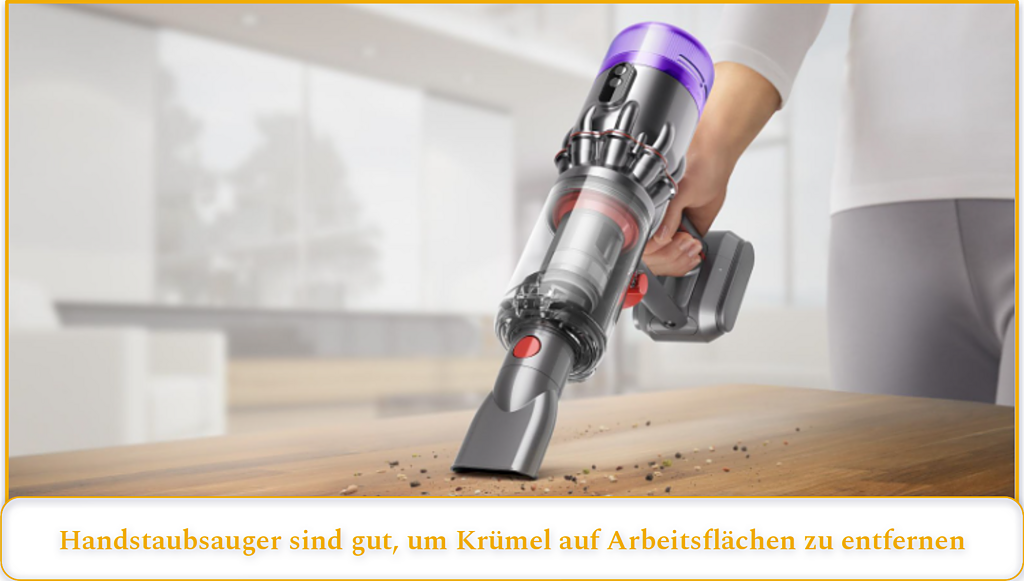 - Auch wenn Handstaubsauger weniger Leistung haben, sind sie ideal, um in enge Bereiche wie Zwischenräume von Polstern zu gelangen.