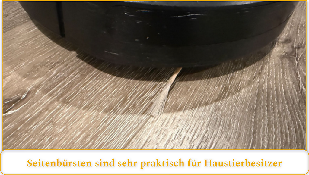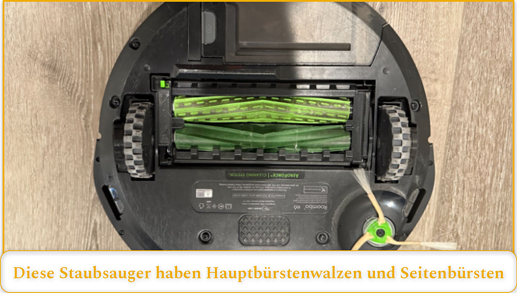 - Seitenbürsten: Sie erweitern die Reinigungsreichweite, indem sie Schmutz von den Rändern in Richtung der zentralen Saugbahn kehren
