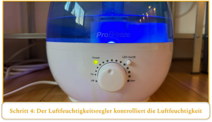 - Lasse den Luftbefeuchter nicht dauerhaft laufen. Nutze das Hygrostat als Orientierung oder schalte ihn aus, sobald die optimale Luftfeuchtigkeit erreicht ist.