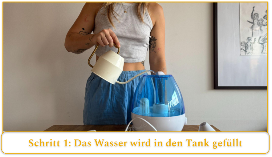 Zu Beginn befüllst du den Tank mit sauberem Leitungswasser oder destilliertem Wasser. Dieses Wasser ist sozusagen die Feuchtigkeitsquelle, die das Gerät an die Luft abgibt.