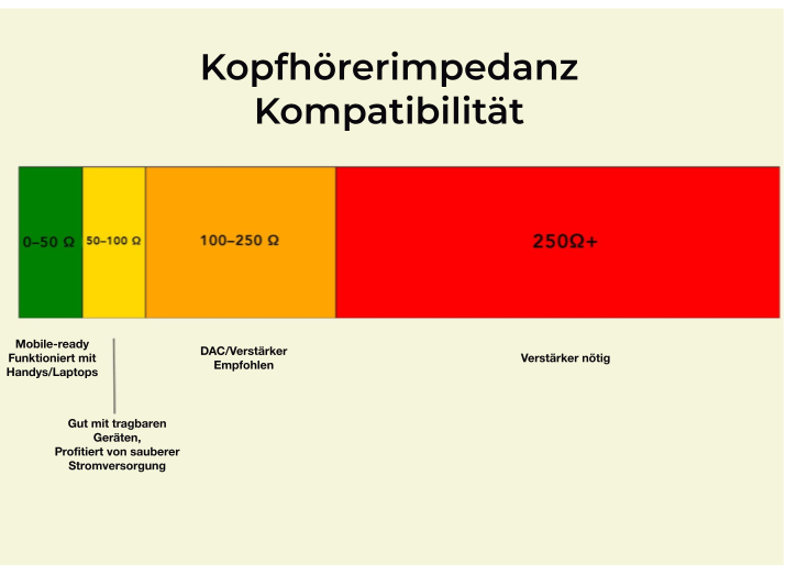 - Impedanz (Ω): Widerstand gegen elektrischen Strom. Kopfhörer mit niedriger Impedanz (<32 Ω) sind für Smartphones und Laptops ausgelegt. Modelle mit hoher Impedanz (80–300 Ω) brauchen eine spezielle Verstärkung, um ihre optimale Leistung zu erreichen.