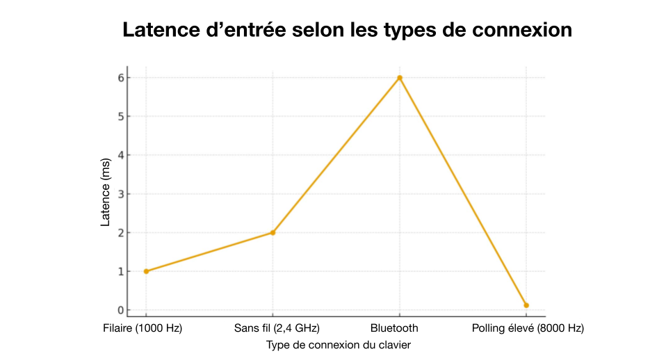 Le délai entre l’appui sur une touche et l’enregistrement de l’action. Une faible latence est essentielle pour le gaming. Les claviers filaires atteignent généralement une latence inférieure à 1 ms, tandis que les modèles sans fil (même haut de gamme, Lightspeed ou Bluetooth) sont souvent quelques millisecondes plus lents. Les joueurs préfèrent souvent un modèle filaire ou un sans-fil très rapide lorsque chaque milliseconde compte.