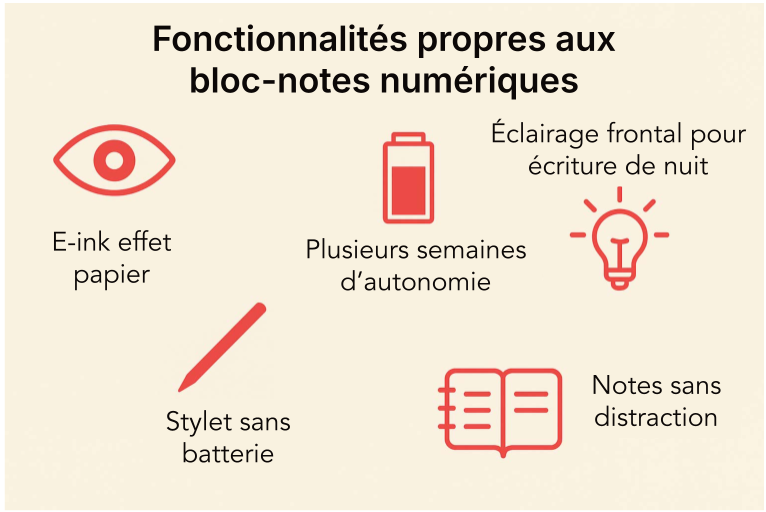 Les blocs-notes numériques sont des tablettes conçues pour offrir une sensation d’écriture proche du papier, tout en stockant et organisant votre écriture manuscrite. Ils privilégient le confort d’écriture, la longue autonomie et la concentration, plutôt que la diversité des applications et le divertissement.
