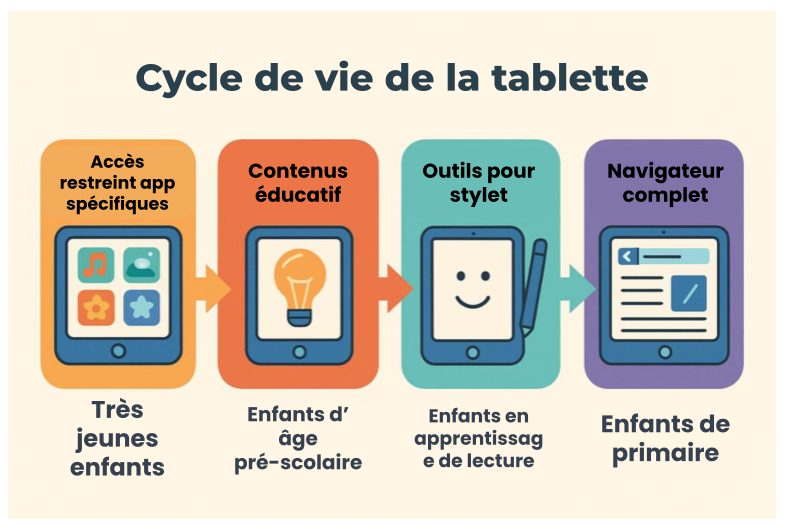 En grandissant, la tablette peut être progressivement déverrouillée pour offrir des fonctionnalités plus avancées, un accès élargi au contenu, ou même une navigation complète sous la supervision d’un adulte.
