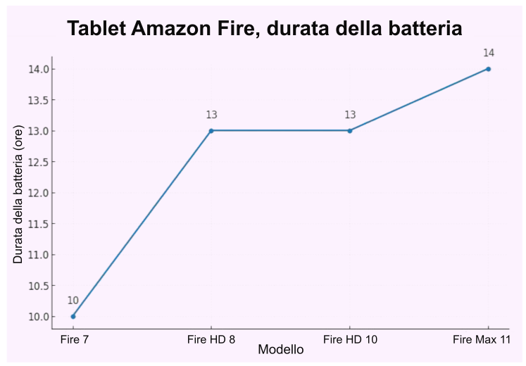 La durata della batteria è costante su tutta la gamma: il Fire 7 ha un’autonomia media di 10 ore, l’HD 8 e l’HD 10 raggiungono circa 13 ore e il Max 11 dura fino a 14 ore. Quindi, gli utenti possono aspettarsi di utilizzare il tablet un’intera giornata senza la necessità di ricaricarlo. Anche se nessuno di questi supporta la ricarica rapida, tutti i modelli più recenti usano USB-C, il che rende più facile ricaricarli con cavi standard.