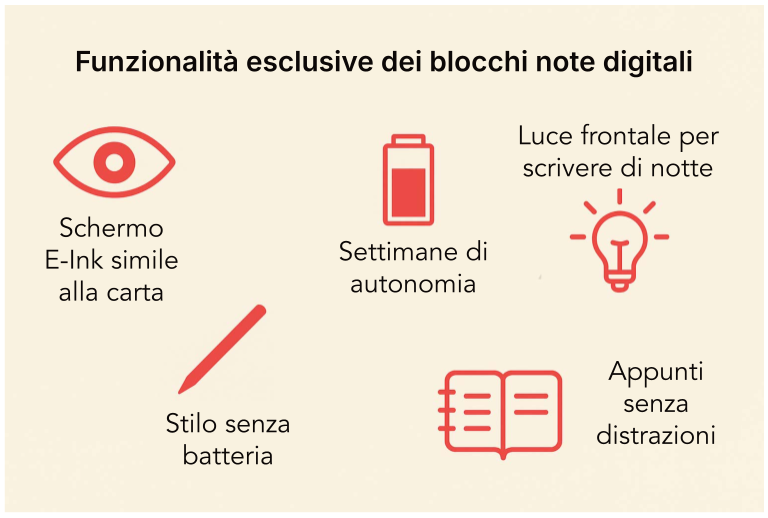 I blocchi note digitali sono tablet specializzati, simili alla carta ma in grado di memorizzare e organizzare gli appunti scritti a mano. Privilegiano il comfort di scrittura, la lunga durata della batteria e la concentrazione, piuttosto che le app e l’intrattenimento.