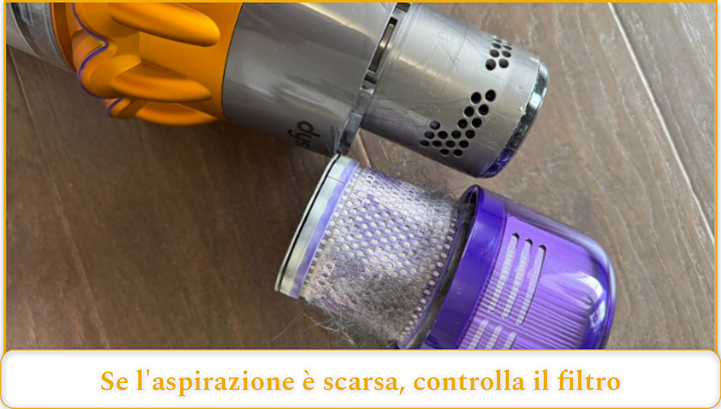 Un’aspirazione debole indica un’ostruzione nel flusso d’aria. Nella maggior parte dei casi, la causa è il sacco di raccolta pieno o il filtro intasato. Svuota/sostituisci prima il sacco di raccolta. Controlla i filtri: gli aspirapolvere ne hanno più di uno. Le gente dimentica spesso i filtri di scarico. Il mio Dyson V8 faticava a raccogliere i peli di gatto con il contenitore vuoto: i filtri sporchi bloccavano l’aspirazione. Una corretta pulizia ha ripristinato la piena potenza.