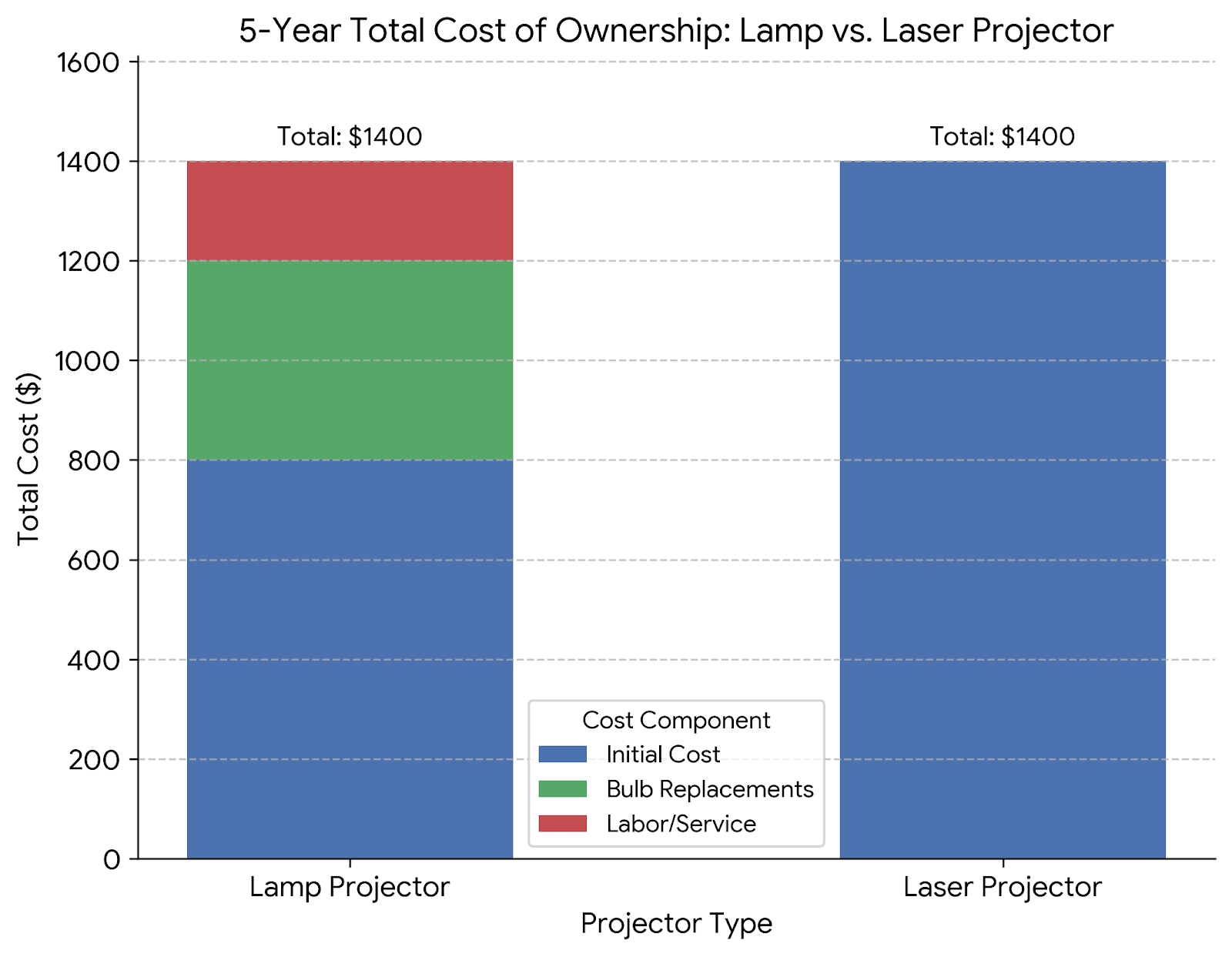 The price premium pays back over 7-10 years through eliminated maintenance. A laser projector costing $1,400 versus an $800 lamp projector breaks even after three bulb replacements plus labor costs.