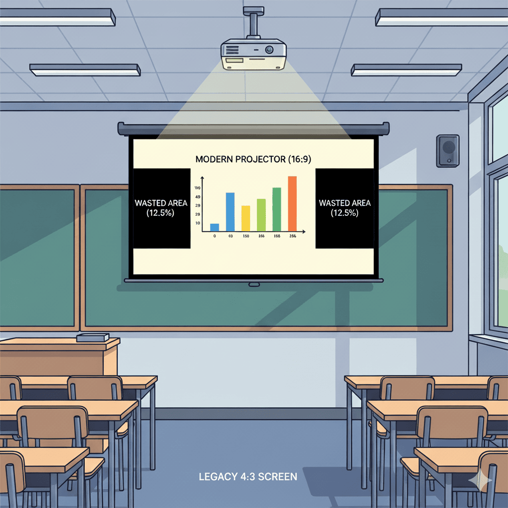 Schools replacing projectors often discover their existing screens don’t match modern aspect ratios. Legacy 4:3 screens waste 25% of display area when paired with new 16:9 projectors, leaving large black bars on sides. A 16:10 projector (WXGA/WUXGA) on a 16:9 screen creates similar issues.